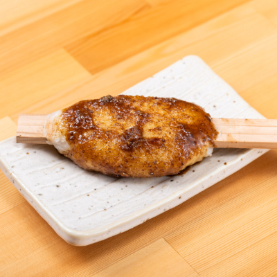 串にお米をつぶしたものを巻きつけ、形を整えてタレをつけて香ばしく焼き上げます。